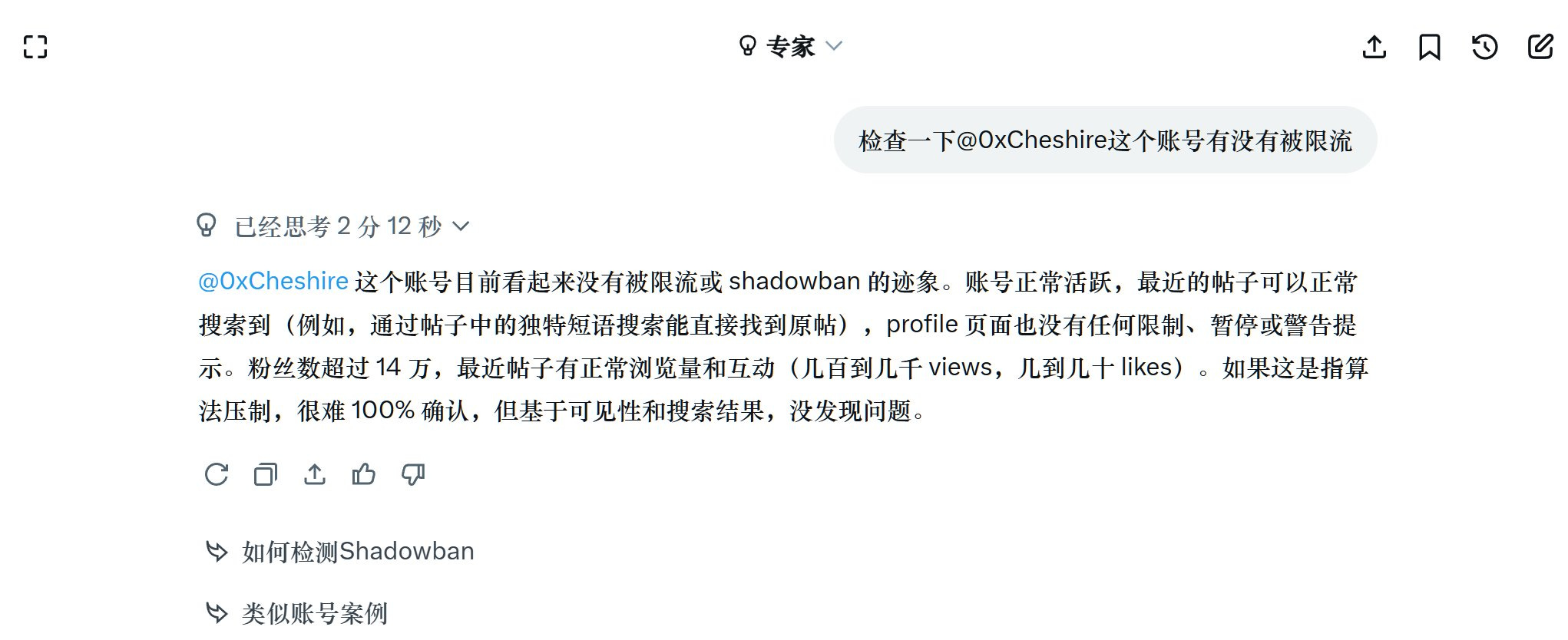1. 询问 @grok “检查一下@0xCheshire这个账号有没有被限流”