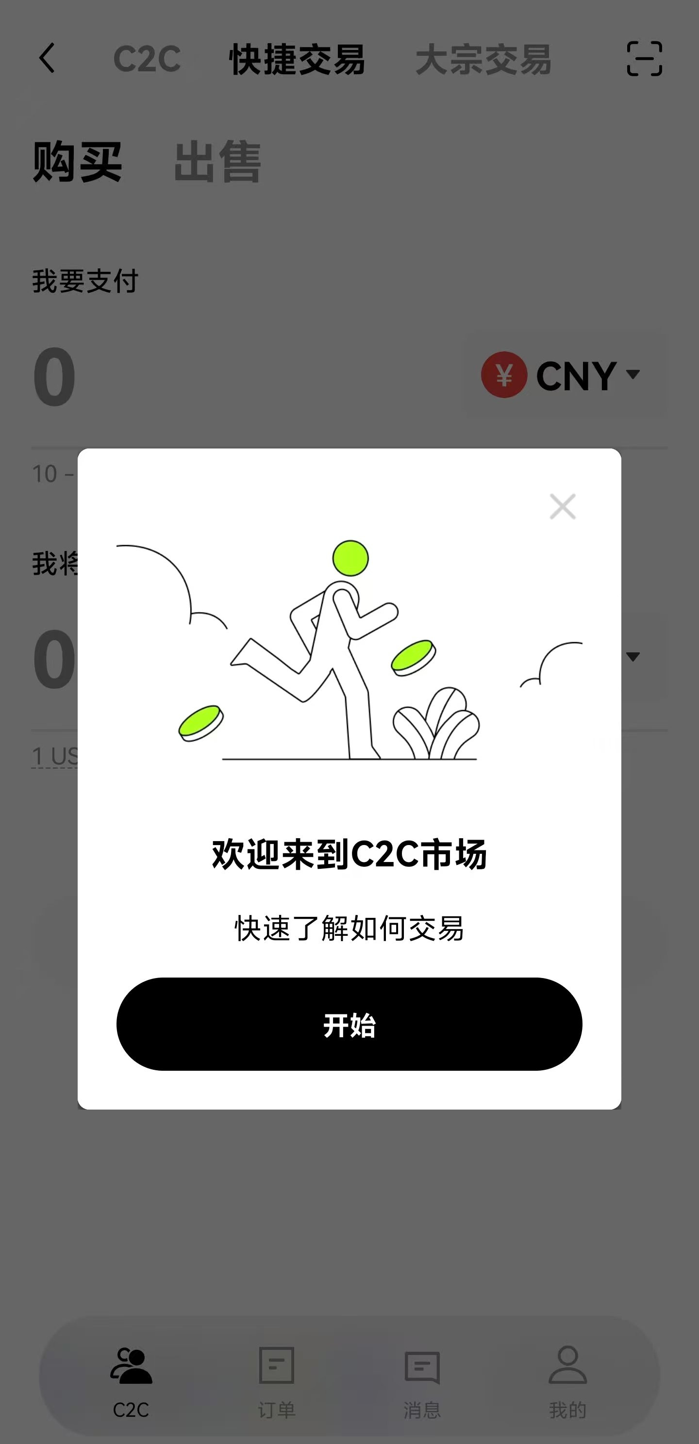 在手机端或者网页版点击这个“C2C 买币”就可以了,快捷买币可以让你方便地用人民币买到 U(也就是币圈里面的美元💵),你还可以在C2C里找到合适的商家进行交易。