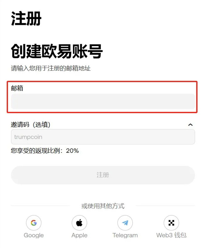 2、输入你的邮箱用来接收验证码。 点开邀请码一栏会看到“返现比例:20%”,这是欧易返佣的最高等级。